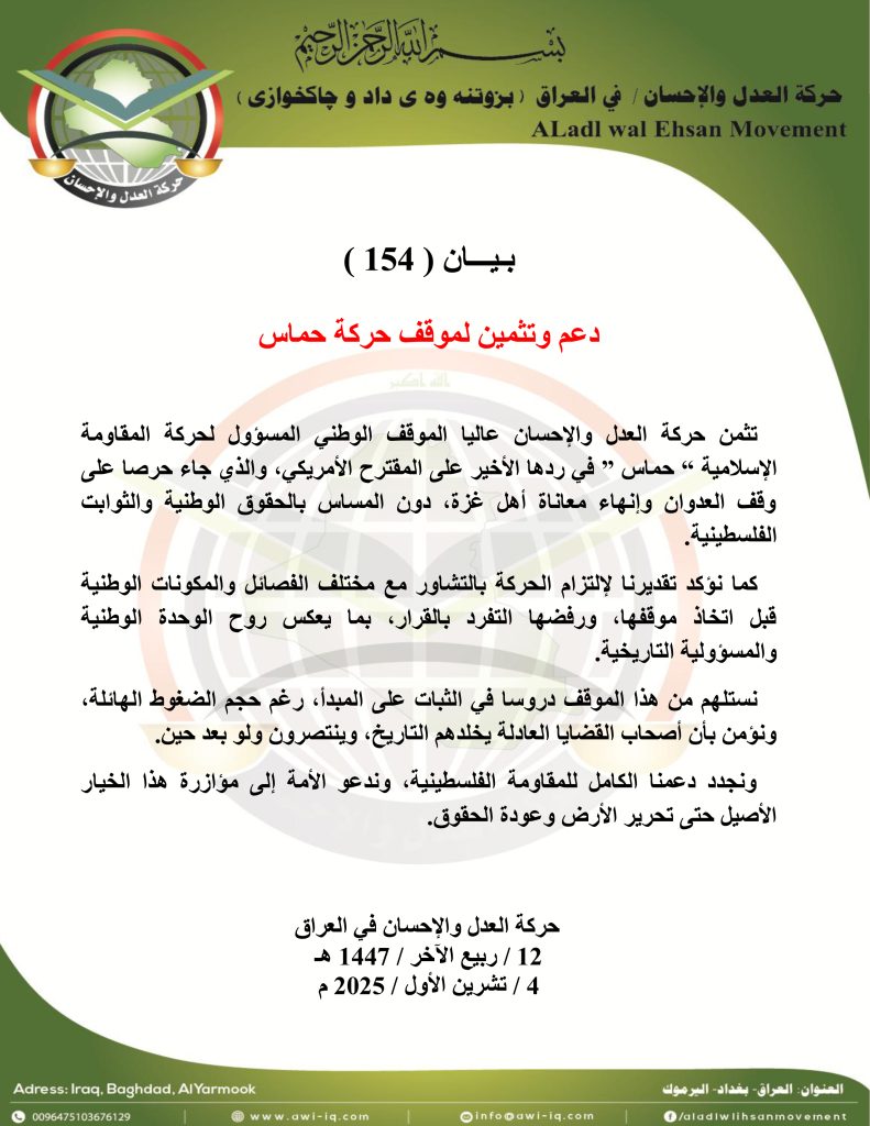 بيان ( 154 ) : حركة العدل والإحسان تدعم وتثمن موقف حركة حماس