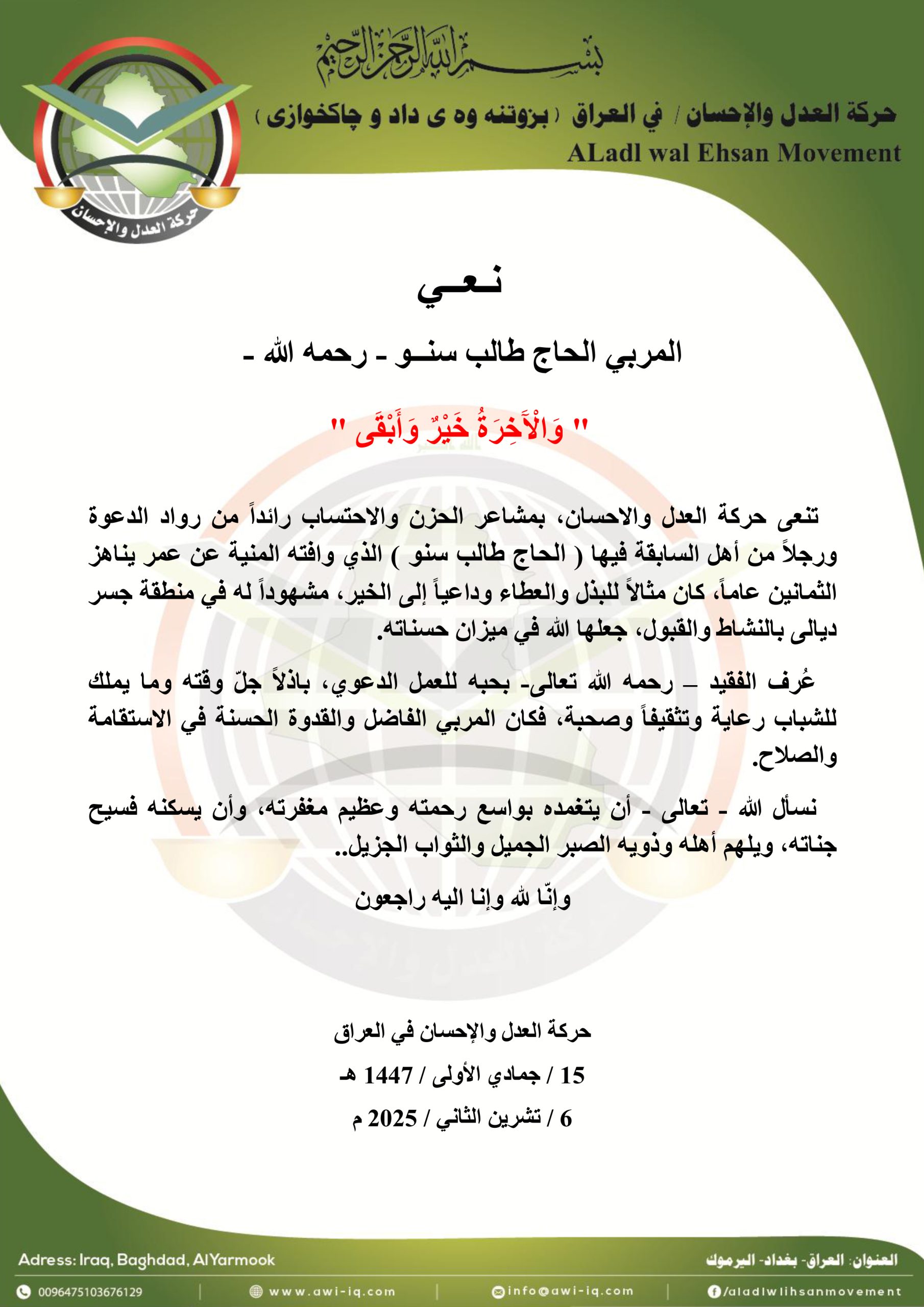 حركة العدل والإحسان تنعى المربي الحاج طالب سنو رحمه الله
