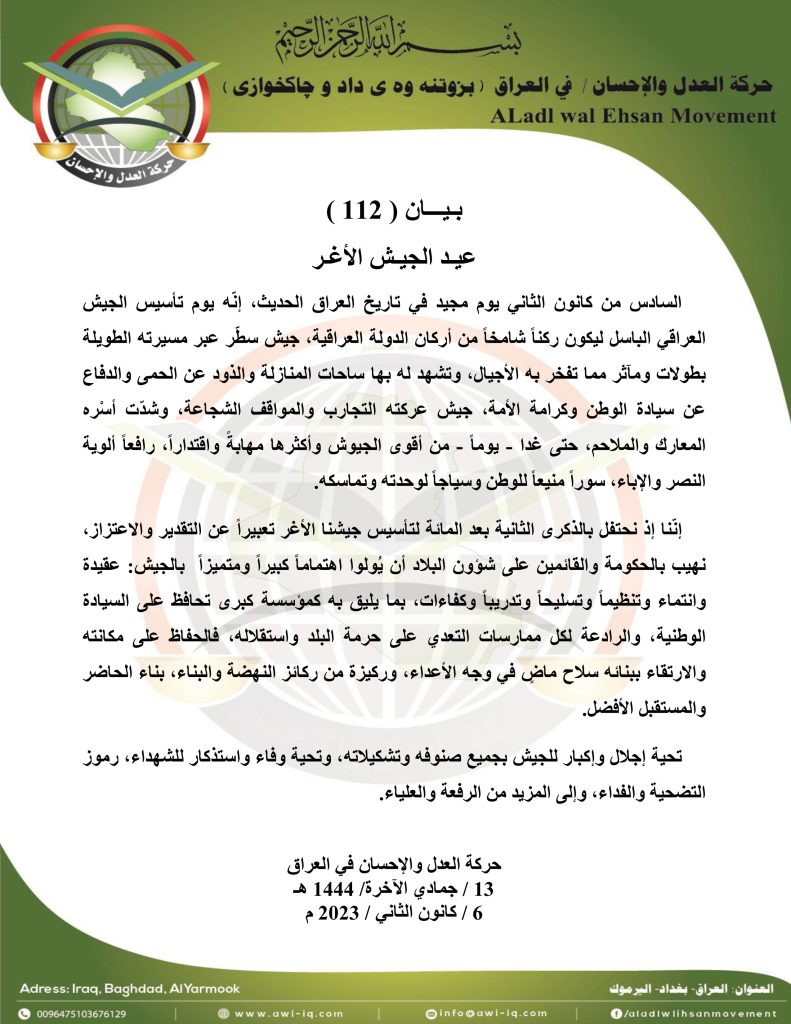 السادس من كانون الثاني يوم مجيد في تاريخ العراق الحديث، إنّه يوم تأسيس الجيش العراقي الباسل ليكون ركناً شامخاً من أركان الدولة العراقية، جيش سطّر عبر مسيرته الطويلة بطولات ومآثر مما تفخر به الأجيال، وتشهد له بها ساحات المنازلة والذود عن الحمى والدفاع عن سيادة الوطن وكرامة الأمة، جيش عركته التجارب والمواقف الشجاعة، وشدّت أسْره المعارك والملاحم، حتى غدا – يوماً – من أقوى الجيوش وأكثرها مهابةً واقتداراً، رافعاً ألوية النصر والإباء، سوراً منيعاً للوطن وسياجاً لوحدته وتماسكه.