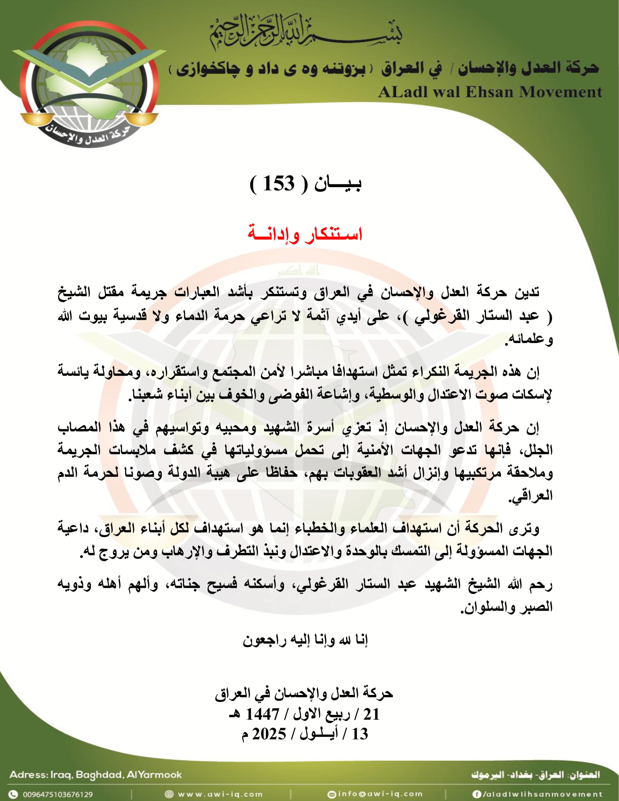 بيان ( 153 ) : استنكــــار وإدانـــــــة جريمة مقتل الشيخ عبد الستار القرغولي 13 سبتمبر، 2025 0 313 FacebookTwitterWhatsApp