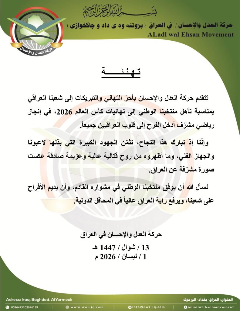 حركة العدل والإحسان تهنىء الشعب العراقي بمناسبة تأهل منتخبنا الوطني لنهائيات كأس العالم 2026 admins 3 ساعات ago